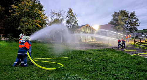 1. Kommandant Pfisterer hatte die Übung beobachtet und bescheinigte den Jugendlichen eine hervorragende Arbeit. 2. Bürgermeisterin Stutz bedankte sich bei den Jugendlichen für ihr Engagement bei der Jugendfeuerwehr und lud zu einer Brotzeit ein.